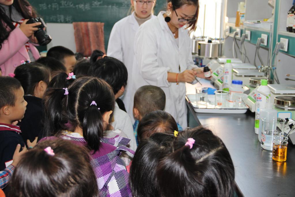 在参观化学实验室时,化学化工学院的研究生大哥哥大姐姐们结合生活为孩子们详细的演示和讲解了“会膨胀的气球”“会变色的花”“自制冰激凌”“油和水相容”等一系列的化学小实验,孩子们通过直观的观察,深刻的感受到了化学变化来源于生活。在观看实验时掌声阵阵想起,孩子们纷纷说回家后要表演给爸爸妈妈看。通过参观化学化工与材料学院,孩子们学到了化学知识、原理和化学常识,感受到了化学世界的魅力,激发了对化学科学的兴趣。