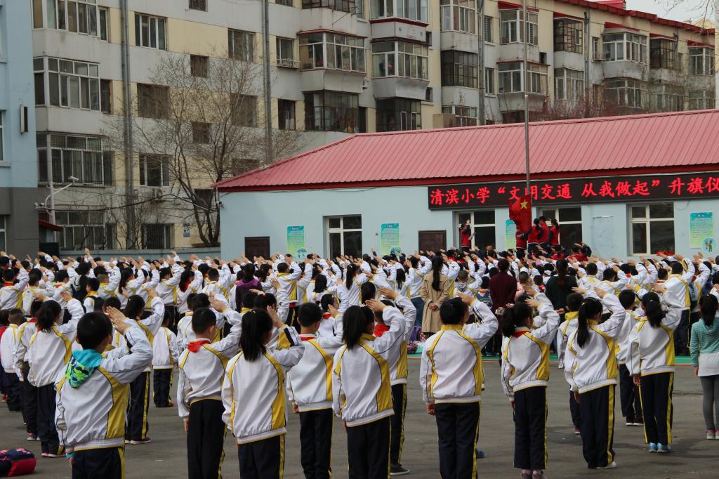 孩子和家长共同参加了清滨小学的《文明交通从我做起》为主题的升旗仪式,和哥哥姐姐们齐唱国歌,体验小学生升旗时的庄严肃穆,知道遵守交通规则和保护自我的重要性。